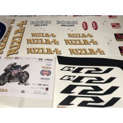 Kit composition: All the stickers you will need to complete your own Superbike's replica: Fender, Tank, Solo Tail, right and left parts of the bodywork. The kit include the rimstripes. Are not included backgrounds, they must be painted.